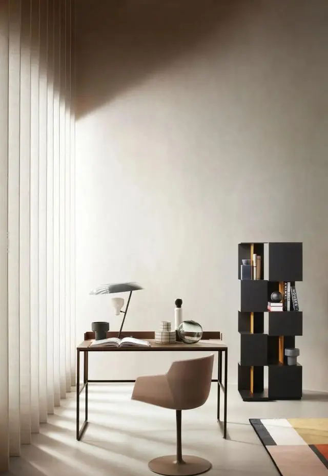 展廳家居物件形色各異,陽光從混凝土百葉窗中照射進來,為MDF Italia品牌增添了光彩。