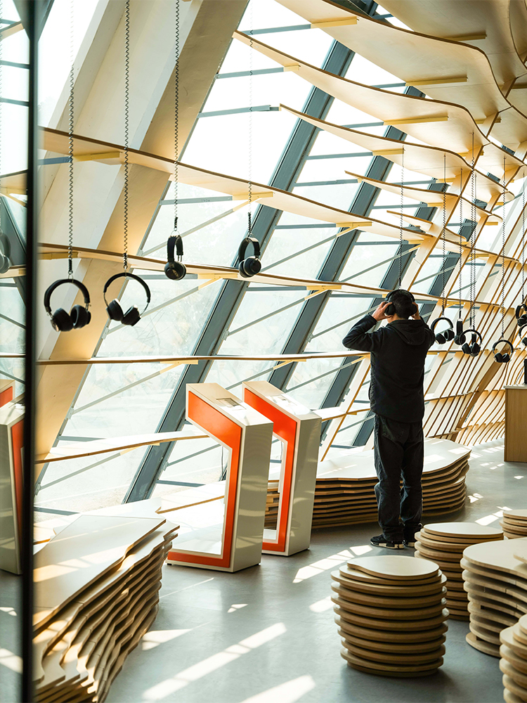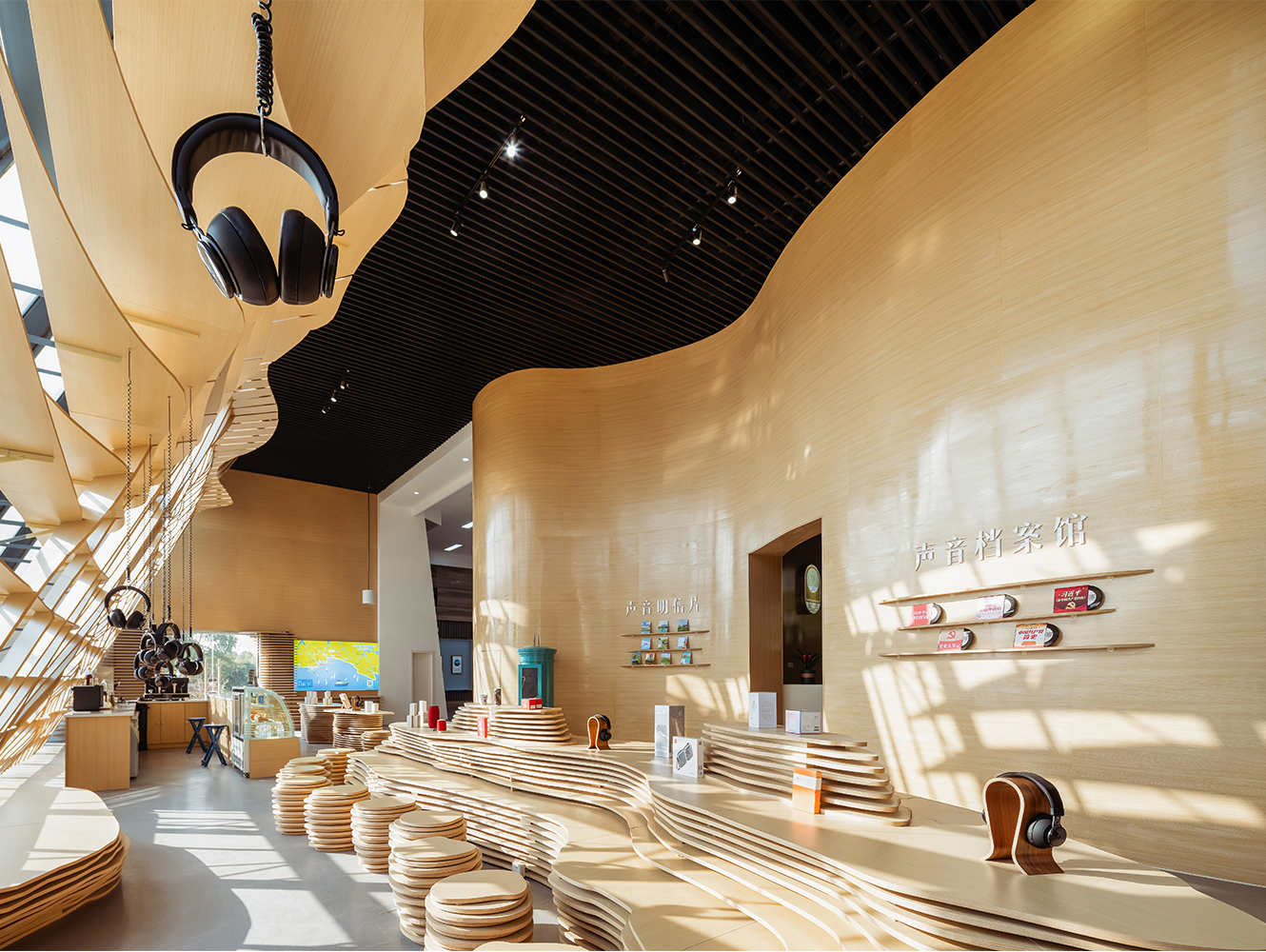 水流的元素貫穿了主廳的整體設計。設計師采用水流的形態將整個空間包覆,所有墻體都由漣漪型的格柵構成,在視覺方面讓游客們感受到回蕩在整個空間內的聲音。除此之外,富有流動感的墻面容納了“聲音明信片”、“聲音檔案館”、“聲音工作坊”等功能,靠窗一側的“耳機森林”、“文創展示”及“休閑座椅”等空間也是依據相同的理念設計而成。展廳內的座椅與展臺也都依托水流形態延伸而成,與墻面風格統一。
