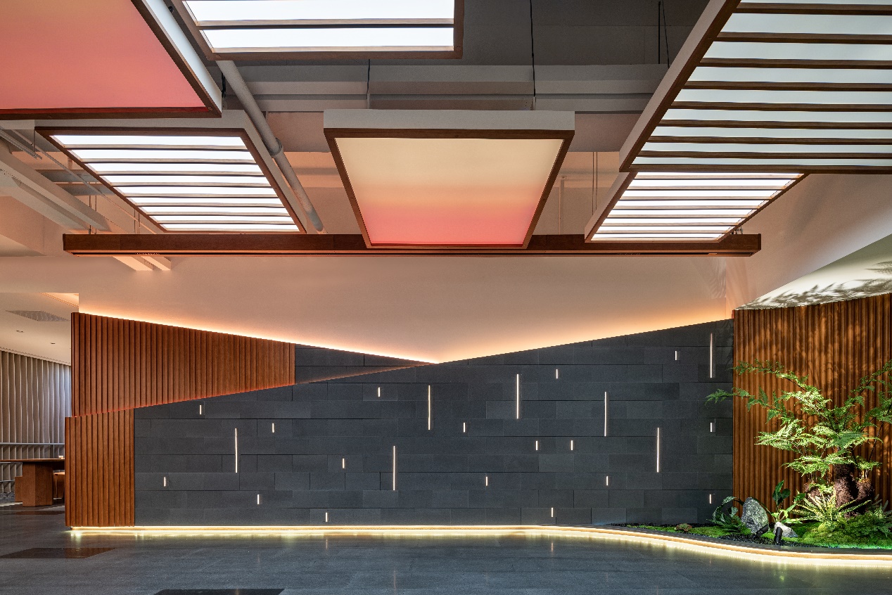 進門處通道采用天然石材與木格柵結合,墻面嵌入呼吸燈,地腳的流水燈帶,延續至大廳,燈光追隨著步伐緩緩亮起,宛如穿插在叢林中照射出的一道道螢火光束。在進門處設計了園林造景,帶人走進了叢林般,感受自然的心聲。