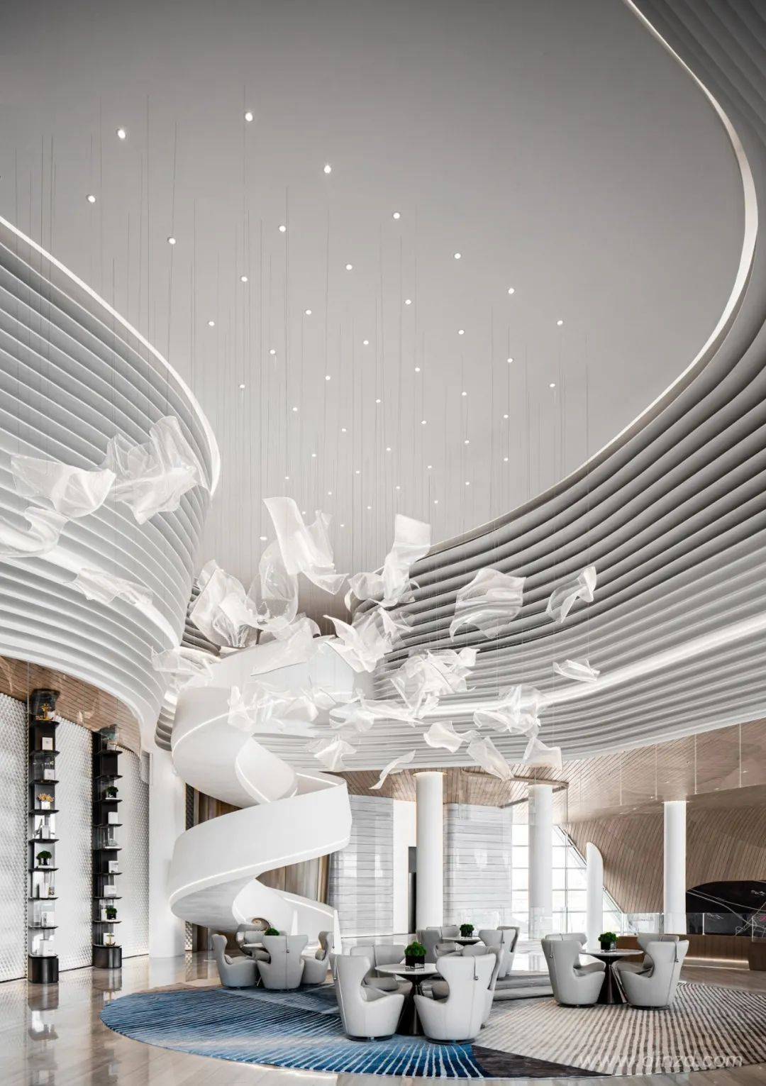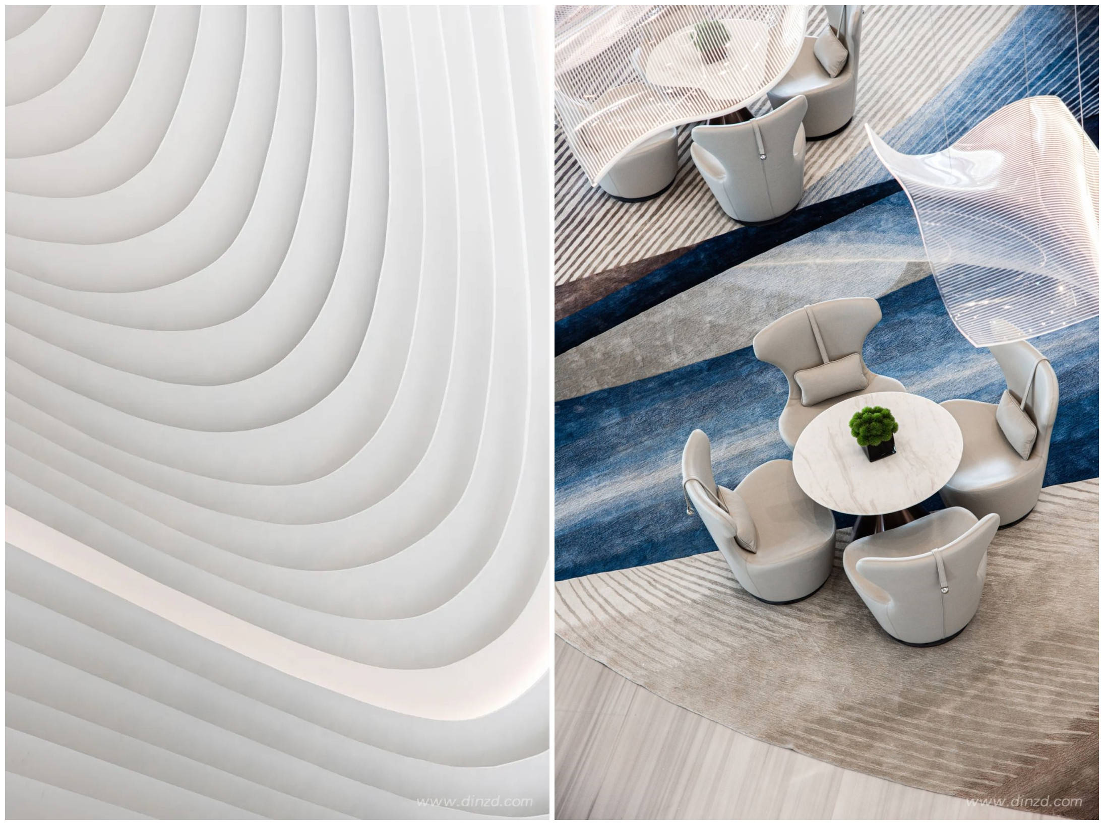 設計師對變化無窮的自然現象的癡迷轉譯成了設計的一部分,海水跟隨潮汐的起落呈現出不同的形態,空間亦是如此。點點星光投射在形狀各異的天花裝置上,靈動而富有生機,層層曲線自由流淌在天花之上,與地面的那一抹藍呼應。