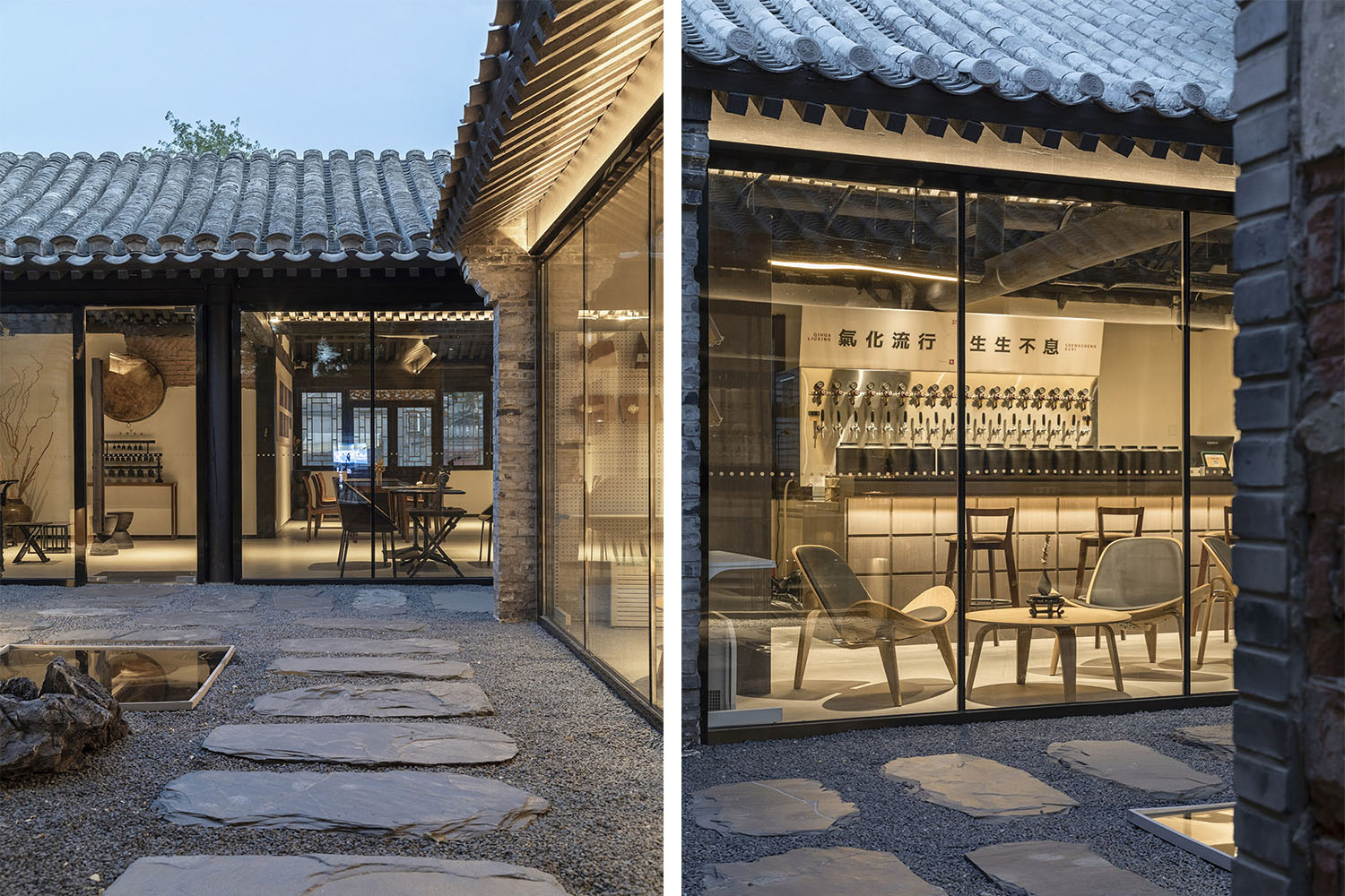 室內(nèi)、建筑與自然在相互界定中融會貫通,形成一個可以相互滲透的空間結(jié)構(gòu)。我們對原有院落中的墻面、門窗、屋架、鋪地等構(gòu)造系統(tǒng)進行了整理與修復。設計建設過程中避免使用與地域及歷史時代不相符的現(xiàn)代工業(yè)材料和處理方式,在此基礎上,把通透屬性的落地玻璃墻嵌入磚混結(jié)構(gòu)的承重柱里,使得室內(nèi)外動靜的變化隨時保持著溝通與互動。