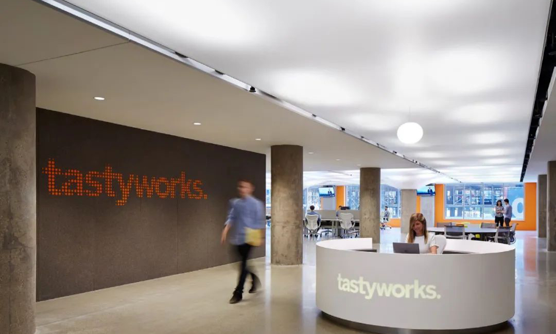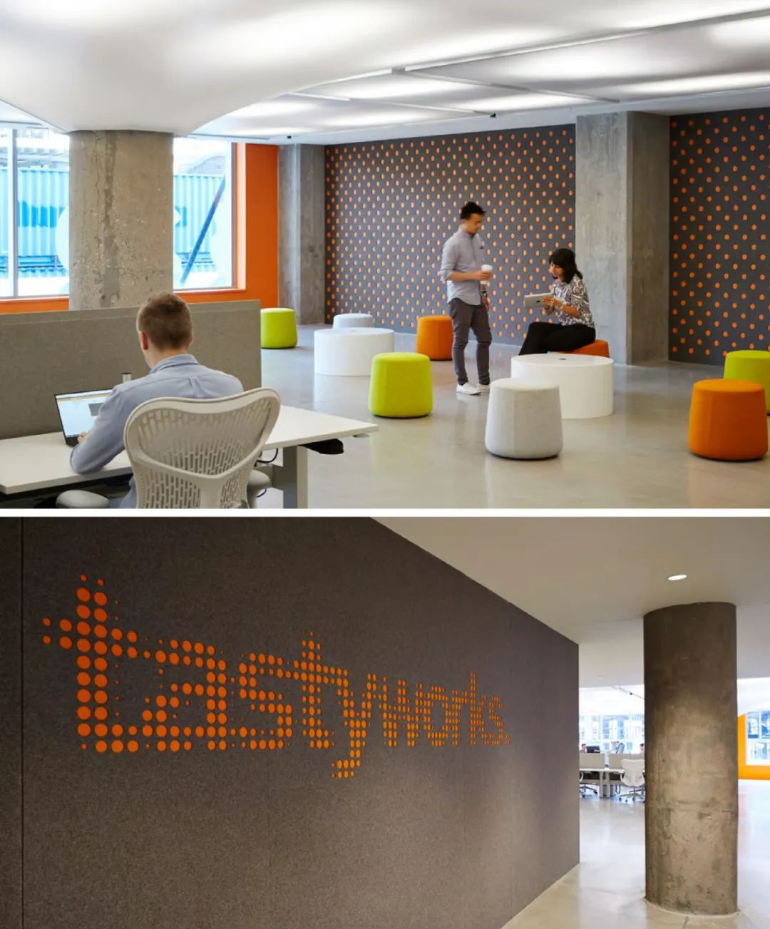 網(wǎng)絡(luò)證券公司Tastyworks的芝加哥辦公室,是一棟冷庫改建的辦公大樓。接待區(qū)的Logo 墻面,設(shè)計(jì)選用了Filzfelt棕色的200和橙色的151色號(hào)羊毛毛氈,雙層疊加后在表層飾面精確鏤空,將Tasty Works公司的logo通過底層明亮的橙色毛氈透出,克制而不張揚(yáng)。